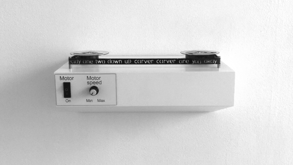 The kinetic sculpture Script, is a dialogue transcript of the film Bring it On, painstakingly scratched into the surface of videotape. The work is a compelling instance of translation transforming the film into a new format. There is no punctuation so each characters line slides seamlessly into another characters in a long continuous line. Script plays on how viewers experience the immediacy of cinema, as you cannot see the scenes or figures depicted, a film in which you think about your watching and watch what you are thinking. Working only from the remnants of information the viewer is encouraged to think about (speaking the lines) what the film or story may be. There are no single interpretations; there are as many interpretations as there are viewers reading it. I regard Script as just as interesting to look at and experience as the film itself.